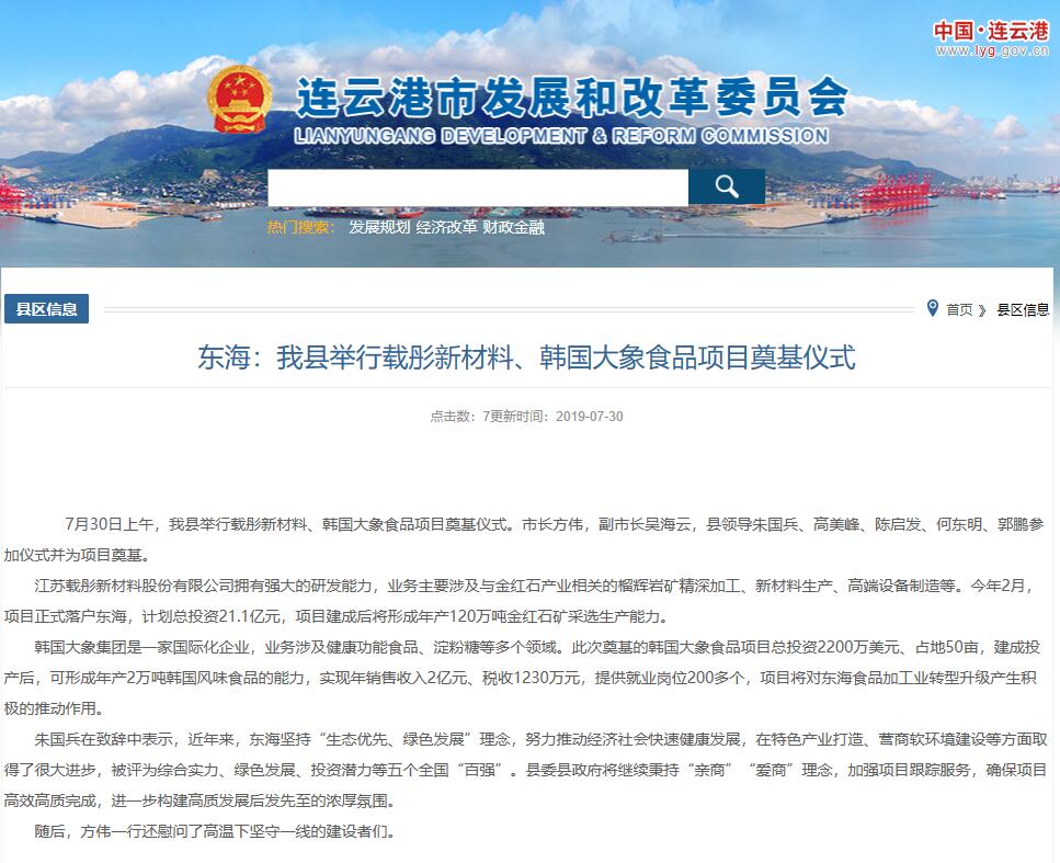 7月30日上午,日照石榴石礦業(yè)東海項目—江蘇載彤新材料金紅石深加工項目在東??h舉行開工奠基儀式,連云港市長方偉,副市長吳海云,東??h領(lǐng)導(dǎo)朱國兵、高美峰、陳啟發(fā)、何東明、郭鵬參加儀式并共同為項目培土奠基。載彤新材料金紅石深加工項目作為縣、市重點(diǎn)推進(jìn)項目受到各方領(lǐng)導(dǎo)和媒體的關(guān)注,連云港市發(fā)展和改革委員會并對奠基儀式進(jìn)行了跟蹤報道。